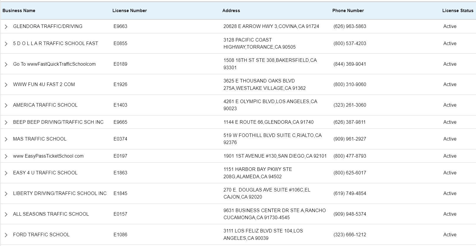When you’re done, click “Search.” The DMV will display a list of traffic schools that meet your requirements. It will also show their address, license status, and contact data.